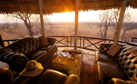 The camp offers 12 spacious, airy Meru-style tents set on high wooden platforms, each with traditional thatched roofs that provide shade. Every tent is themed around the history of an explorer or slave trader, and features a private veranda where guests can relax while watching wildlife around the camp.
