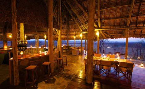 The main dining banda sits atop the hill with stunning 360-degree panoramic views. Built in classic Swahili style with a steeply pitched roof, the dining area surrounds a central bar with seating and dining areas facing all directions. Just below the main building is a shaded sitting area next to the swimming pool, allowing guests to cool off while continuing to enjoy game viewing right from the pool’s edge.