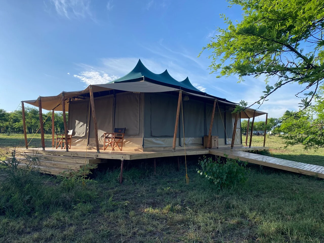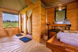 The camp features 17 fully furnished, self-contained wooden safari tents, including three spacious family units that can host up to six guests. Each tent comes with queen-size beds, private bathrooms with flushing toilets and showers, free Wi-Fi, a veranda with seating, and solar-powered electricity and hot water for a comfortable and eco-friendly stay.